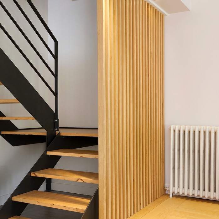 Pour assurer une communication fluide entre les deux niveaux et éviter le cloisonnement qui caractérisait auparavant la maison, un large escalier intérieur est créé. Conçu comme un élément architectural à part entière, il devient une pièce maîtresse du projet. Ses lignes épurées et son design soigné en font bien plus qu’un simple moyen d’accéder à l’étage : il structure l’espace, joue avec la lumière et apporte une dimension sculpturale à l’intérieur.