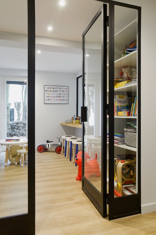 Au-delà de la lumière, la redistribution des espaces a été une étape clé de la transformation. Cet ancien garage, longtemps utilisé comme débarras, accueille désormais une chambre confortable pour les invités, avec une salle de bain attenante. Loin d’être une simple pièce d’appoint, cette suite bénéficie d’un aménagement soigné et d’une atmosphère chaleureuse, grâce à un travail minutieux sur les matériaux et les finitions. Face à la descente d’escalier, une salle de jeux a été créée, largement vitrée sur le jardin pour offrir une sensation de grandeur et une belle luminosité. Cet espace polyvalent peut être utilisé aussi bien pour les moments de détente en famille que comme coin lecture ou espace de travail. Côté cour, la nouvelle configuration a permis d’implanter une buanderie fonctionnelle, intégrant des rangements discrets et des équipements optimisés pour répondre aux besoins quotidiens des occupants. À côté, un atelier de tapisserie a été spécialement aménagé pour madame, offrant un espace dédié à la créativité et aux travaux manuels.